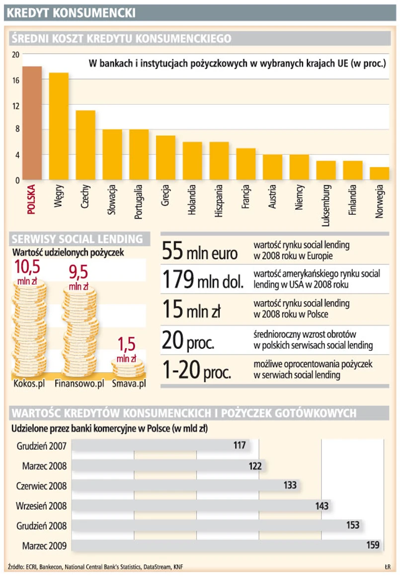 Na wakacje, na sprzęt rehabilitacyjny, na nowy komputer, ale także na uruchomienie własnego biznesu... Takie rzeczy ludzie finansują z pożyczek zaciągniętych w trzech działających w Polsce internetowych serwisach pożyczkowych (z ang. social lending) Kokos.pl, Finansowo.pl i Smava.pl. Zainteresowanie nimi wciąż rośnie po części z powodu ostrzejszej polityki kredytowej banków, ale mimo kryzysu stale przybywa też osób gotowych pożyczyć pieniądze innym, licząc na pomnożenie majątku. Część serwisów social lending przechodzi dziś do ofensywy, licząc, że położenie nacisku na większe bezpieczeństwo pozwoli im dalej rosnąć i przyciągać klientów.