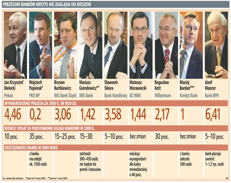 Ratując wyniki finansowe, niemal wszystkie czołowe banki zdecydowały się w tym roku na podwyżki opłat za prowadzenie kont osobistych czy wydanie kart płatniczych, w skrajnych przypadkach nawet o 35 proc. Równie ochoczo banki szukają oszczędności kosztem szeregowych pracowników. Od początku roku pracę straciło ponad 5 tys. bankowców. A według różnych szacunków w całym roku może to być nawet kilkanaście tys. ze 181 tys. zatrudnionych na początku.