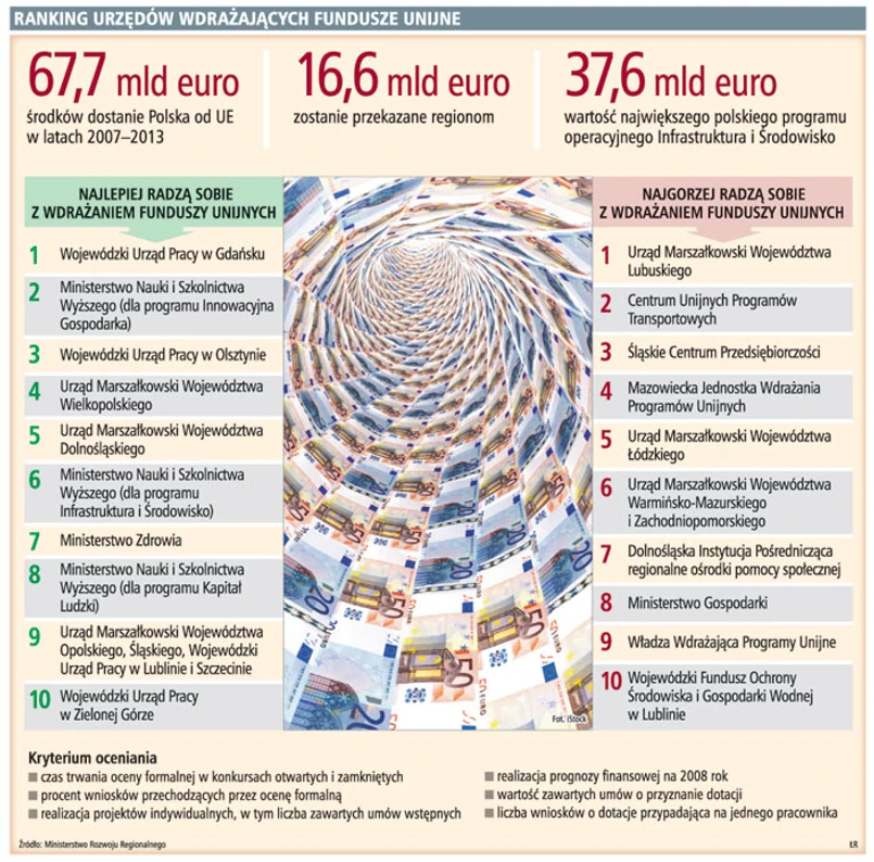 Miejsca w czołowej dziesiątce zajęły instytucje regionalne. Dominują wojewódzkie urzędy pracy oraz urzędy marszałkowskie: wielkopolski, śląski i opolski. Dwa ostatnie jako pierwsze w Polsce rozpoczęły konkursy o unijne dotacje. Śląsk – już w grudniu 2007 r., a Opolskie na początku 2008 roku. – Nasze wysokie miejsce to efekt przestrzegania terminów oceny wniosków w konkursach, małej liczby wniosków, która była odrzucana, oraz terminowości w realizacji projektów kluczowych – mówi Radosław Krawczykowski, dyrektor z Wielkopolskiego Urzędu Marszałkowskiego. Przygotowane przez MRR zestawienie pokazuje dysproporcje w pracy urzędów. Najbardziej szokujące są dane dotyczące czasu oceny wniosków, składanych przez beneficjentów. W najlepszych urzędach ocena formalna trwa kilka dni. W najgorszych ponad 100 (Śląskie Centrum Przedsiębiorczości – 163 dni czy Mazowiecka Jednostka Wdrażania Programów Unijnych – 123 dni).