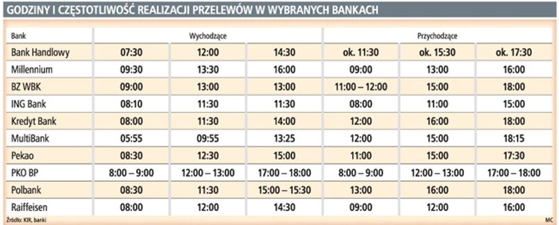 Długie oczekiwanie na pojawienie się pieniędzy na koncie nie zawsze wynika ze złej woli czy nierzetelności naszego płatnika. Czasami wina leży po stronie banków, które obracają naszymi pieniędzmi. Przelewy krajowe pomiędzy bankami w Polsce są bowiem realizowane za pośrednictwem Krajowej Izby Rozliczeniowej (KIR), która zbiera, przetwarza i przekazuje w formie plików transakcyjnych informacje o przelewach realizowanych pomiędzy uczestnikami systemu. Każdy bank ma możliwość przesyłania i otrzymywania informacji do i od KIR, opierając się na samodzielnie ustalonym harmonogramie sesji.