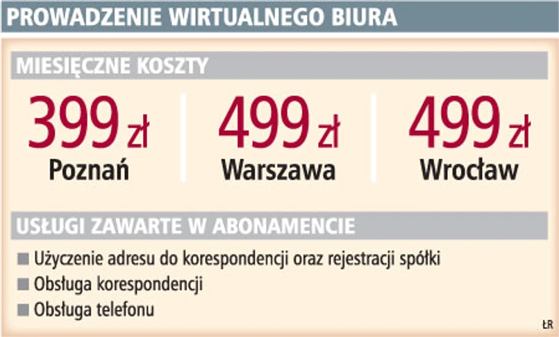 Koszt prowadzenia wirtualnego biura w Warszawie to około 400 zł. W zakres takiego najtańszego pakietu wchodzą przykładowo – użyczenie adresu, obsługa korespondencji i dostęp do powierzchni biurowej przez cztery godziny miesięcznie. Koszt założenia wirtualnego biura za granicą to 99 franków szwajcarskich. Miesięczne opłaty wynoszą 590 franków.