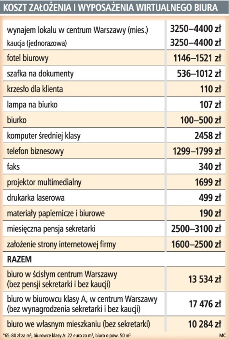 Wirtualne biuro to działalność, którą może założyć nawet zupełnie niedoświadczony młody przedsiębiorca. Pomysł wymaga minimalnych nakładów oraz kosztów. Na początek wystarczy własne mieszkanie oraz standardowy sprzęt biurowy: komputer, drukarka i telefon z faksem. Można też rozpocząć działalność z tzw. wyższej półki, wynajmując biuro w atrakcyjnym komunikacyjnie i biznesowo miejscu, ale to już sporo kosztuje.