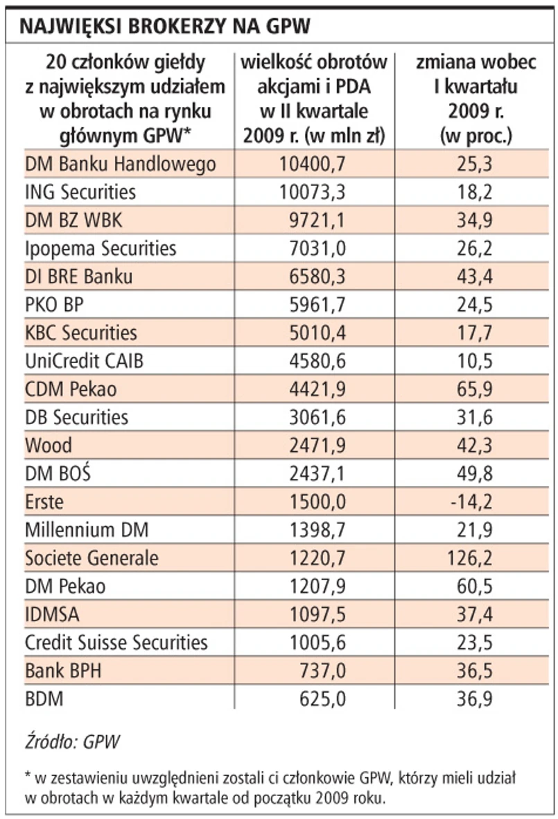 Domy maklerskie nie podają jeszcze oficjalnych danych o wynikach, jakie uzyskały w II kwartale, ale brokerzy specjalizujący się w pośredniczeniu w transakcjach na giełdzie już mówią o kwartale lepszym niż poprzedni. Poza większymi obrotami na ich przychody z prowizji korzystnie działały też wzrosty kursów (WIG zyskał w II kwartale 26,6 proc.).