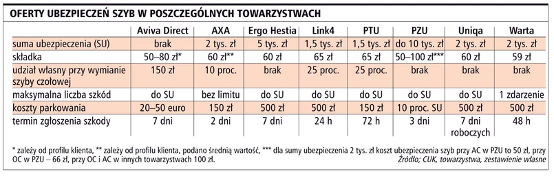 Za podobną cenę dostajemy jednak dość różne oferty. Niektóre towarzystwa przewidują, że aż 25 proc. kosztów wymiany szyby czołowej trzeba będzie pokryć z własnej kieszeni. Istotne jest też, ile razy może zdarzyć się nam taka szkoda. Dla przykładu: Warta przewiduje, że raz w roku. W innych towarzystwach limitem jest suma ubezpieczenia, która przy standardowej wysokości 1,5–2 tys. zł nie wystarczy na wymianę np. szyby przedniej dwa razu w roku. W PZU można określić ten limit na 1 tys.–10 tys. zł, a w Ergo Hestii wynosi on 5 tys. zł.