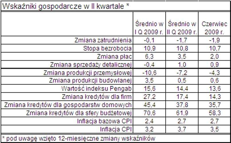 Największy progres w II kwartale w porównaniu z sytuacją z trzech pierwszych miesięcy tego roku widać w zakresie produkcji przemysłowej. Obniżała się ona w II kwartale średnio w miesiącu o 7,2% w porównaniu z sytuacją sprzed roku. Kwartał wcześniej spadek sięgał przeciętnie 10,6%. Poprawę widać też w przypadku sprzedaży detalicznej. Roczna zmiana w II kwartale sięgała średnio 1% na miesiąc wobec spadku o 0,4% w I kwartale 2009 r. O ile w obu przypadkach odnotowaliśmy progres, to trzeba zwrócić uwagę, że produkcja przemysłowa wychodzi z rekordowej zapaści, przed którą obronili się na razie konsumenci. Jednak i tu i tu zmiany w II kwartale utrzymały się na poziomach albo rekordowo słabych albo bliskich najgorszym w historii. Na przykład dla produkcji przemysłowej II kwartał tego roku był 2. najgorszym w historii tych danych, sięgającej 1992 r. Dla sprzedaży detalicznej było podobnie (historia tych danych sięga 1996 r.). W II kwartale wyraźnie też hamowała produkcja budowlana, której wzrost wyniósł średnio jedynie 0,5% wobec 3,5% w I kwartale 2009 r.