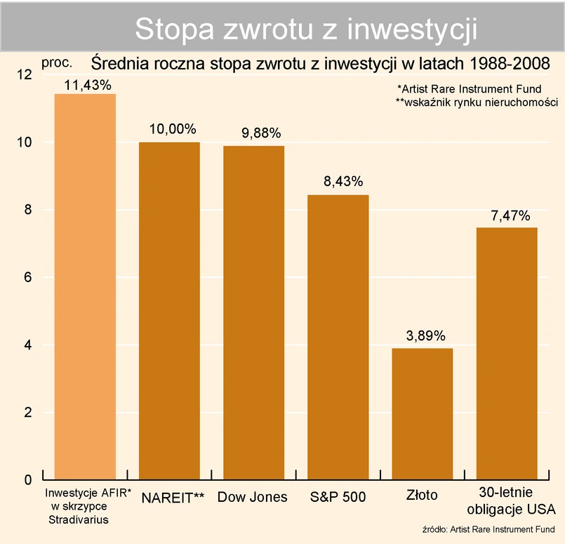 Jeśli inwestycje w skrzypce porównać z indeksami giełdowymi, to skrzypce zdecydowanie wygrywają, gdy chodzi o stopy zwrotu. ARIF podaje, że w latach 1988 – 2008 średni roczny zwrot na kapitale przy inwestycjach w instrumenty wynosił 11,43 proc., a w Dow Jones – 9,88 proc. S&P 500 dał w tym okresie 8,43 proc rocznie. A złoto – tylko 3,89 proc.