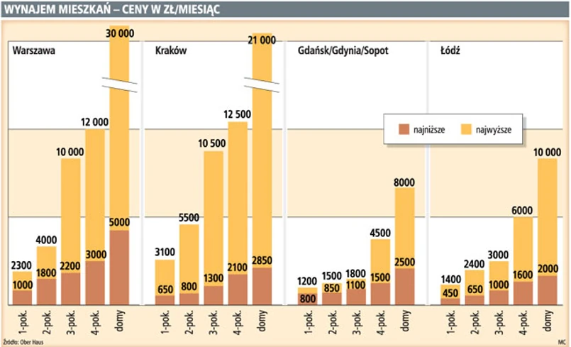 Trzeba jednak wyjątkowego szczęścia, żeby w centrum Warszawy wynająć kawalerkę za 1 tys. zł miesięcznie. Za co piąte wynajmowane mieszkanie trzeba zapłacić czynsz od 2,4 do 3,0 tys. zł. Jednocześnie Ober Haus Agencja Nieruchomości zwraca uwagę, że w Warszawie coraz większe znaczenie ma segment nieruchomości luksusowych. Co dziesiąte wynajmowane lokum ma wystawioną cenę od 4,5 tys. do 15 tys. zł za miesiąc.