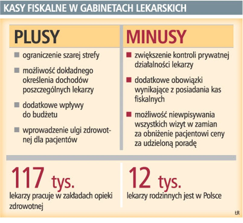 Wprowadzenie kas fiskalnych do gabinetów lekarskich pozwoliłoby, zdaniem zwolenników takiego rozwiązania, na lepszą kontrolę dochodów lekarzy. Plany takie miało Ministerstwo Zdrowia, kiedy jego szefem był profesor Zbigniew Religa. Pomysł nie zyskał jednak akceptacji ówczesnego ministra finansów.