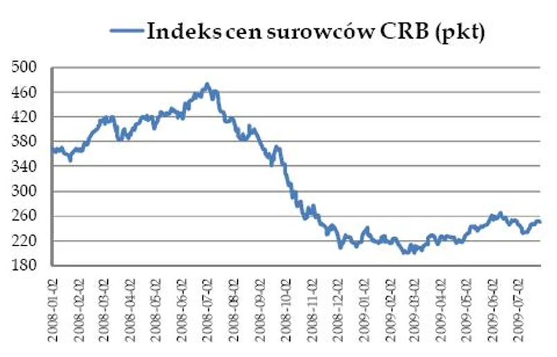 Ostatnie dni nie były w stanie wyeliminować znacznej dysproporcji w zachowaniu rynku surowców, który nie był w stanie pokonać czerwcowej górki oraz wschodzących rynków akcji, które wyszły wyraźnie ponad nią. Słabość towarów w ostatnim czasie to głównie efekt wyprzedaży produktów rolnych takich, jak kukurydza, pszenica, czy soja. Jednak wśród surowców idących o ponad 10% w dół w porównaniu ze szczytem indeksu CRB z 11 czerwca mamy również srebro, ropę naftową, gaz naturalny. Wśród najlepiej zachowujących się w tym czasie towarów znalazły się sok pomarańczowy oraz cukier, zyskujące po ponad 10%. Niewielkie zmiany były udziałem złota oraz miedzi.