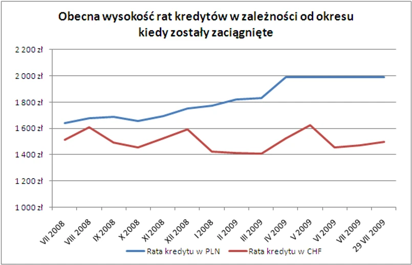 Mimo obniżenia stawki WIBOR raty kredytów w złotych pozostają znacznie wyższe od kredytów walutowych. Najtańsze są nadal kredyty we frankach szwajcarskich. Choć przeciętna marża zaciąganych obecnie kredytów w szwajcarskiej walucie wynosi aż 3,6%, to niskie oprocentowanie zapewnia im LIBOR CHF, który wynosi zaledwie 0,36%. W rezultacie oprocentowanie kredytu wynosi zaledwie 3,96%, a rata 1533 zł. Jest ona więc aż o 455 zł niższa od raty kredytu w złotych.