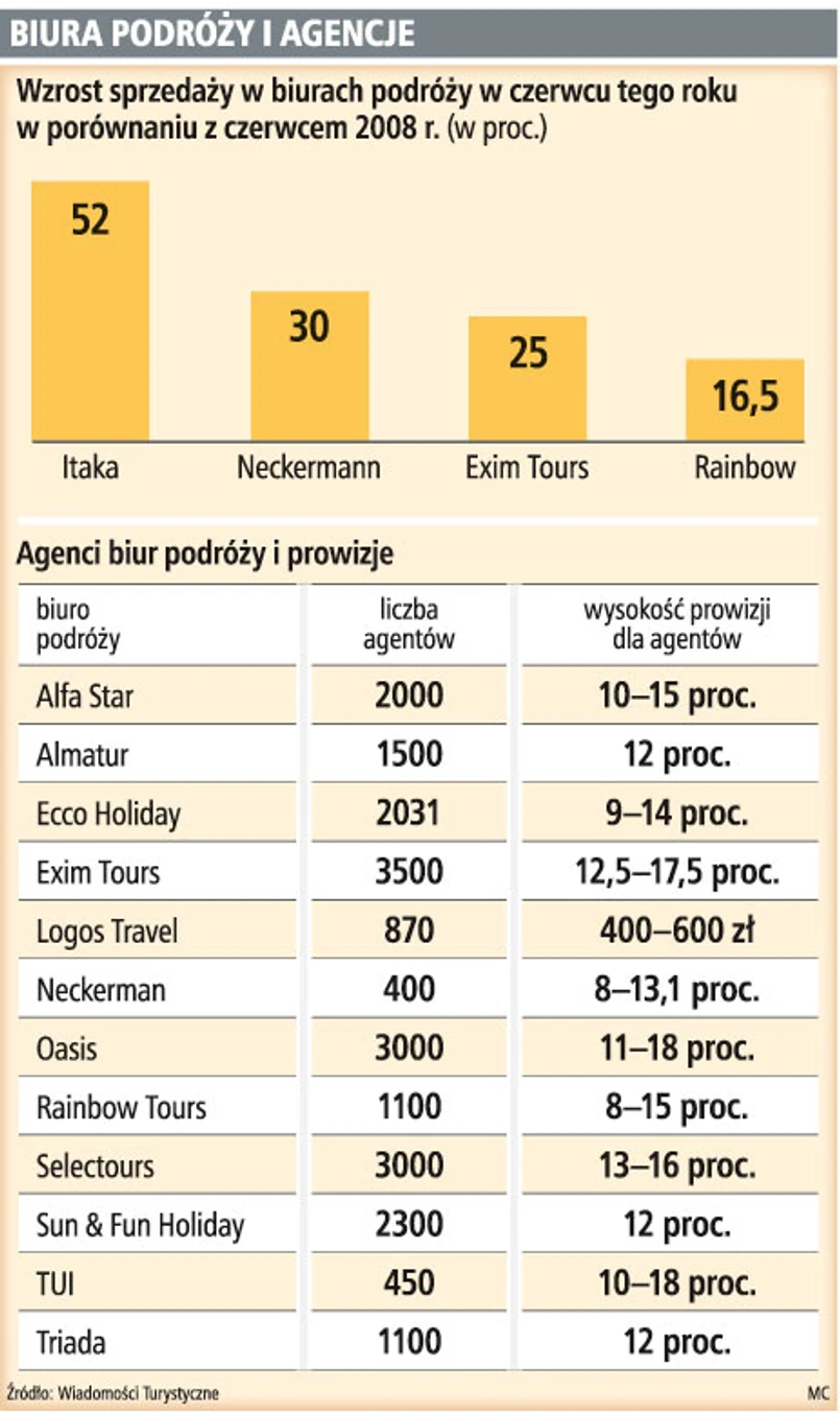Jak dodaje, w tej chwili prowizja w Itace wynosi 11 proc. Większą prowizję w czerwcu zdecydował się przyznać swoim agentom także Rainbow Tours. Jak informuje Grzegorz Baszczyński, prezes biura, prowizja wzrosła o 2 proc., ale tylko za sprzedaż wycieczek na wybranych kierunkach. Exim Tours za sprzedaż wyjazdów do Turcji płaci 16-proc. prowizję, a w pozostałych przypadkach – 12,5 proc.