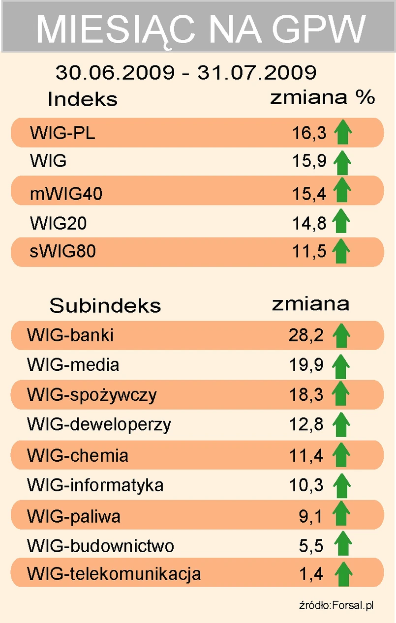 Zdecydowanie najlepszą branżą warszawskiej giełdy pod względem dynamiki wzrostu cen akcji były banki. Od końca czerwca indeks WIG-Banki zyskał 28,2 proc. Największe wzrosty zanotowały wcześniej wspomniane BZ WBK, ING, Millennium i BPH. Całkiem nieźle można było zarobić także na walorach PKO BP (30,6 proc.), Kredyt Banku (27,6proc.) oraz Pekao SA (27,2 proc.).