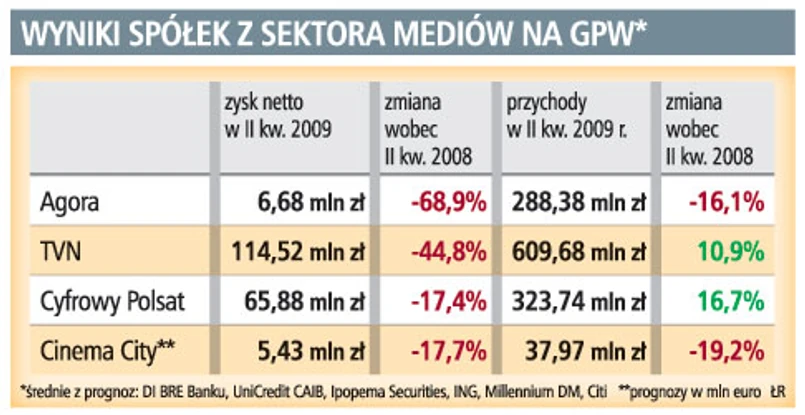 Od rynku reklamowego mocno uzależniony jest też TVN. Według prognoz zysk firmy w II kwartale był o niemal 45 proc. niższy niż rok temu. Piotr Grzybowski z DI BRE szacuje, że rynek reklamowy zacznie ponownie rosnąć dopiero w 2011 roku. Tymczasem TVN zapowiada, że kosztów raczej ścinać nie będzie. To oznacza, że wyniki firmy zaczną się poprawiać dopiero, kiedy poprawi się sytuacja na rynku reklamowym. Analityk DI BRE dodaje, że takie rozwiązanie leży jednak w długoterminowym interesie spółki.