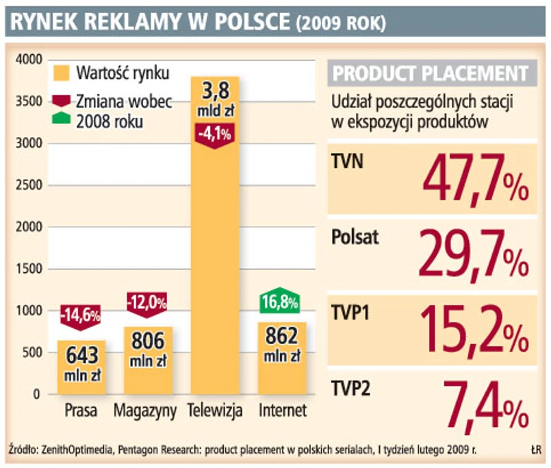 Wydatki reklamodawców na product placement to ułamek całego rynku reklamy, ale stale rosną. Według PQ Media w ubiegłym roku w Polsce przeznaczono na to około 42 mln dol. Za dwa lata wydatki wzrosnąć mają do 63 mln dol.