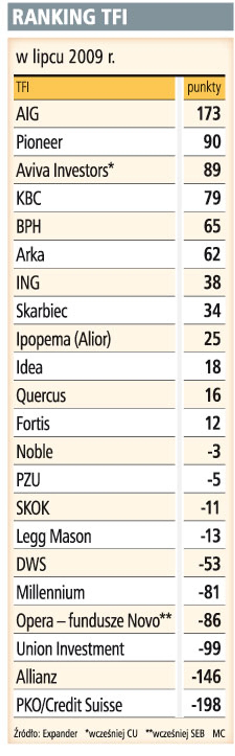 Najlepsze wyniki inwestycyjne w rankingu osiągnęło AIG TFI (173 pkt), głównie dzięki wynikom AIG Akcji Nowa Europa i AIG Obligacji FIO. Najsłabiej wypadł PKO TFI (-198 pkt), m.in. z powodu wyników PKO/CS Małych Spółek Japońskich oraz PKO/CS Japońskiego Rynku Akcji.