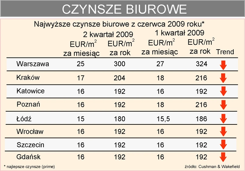 Średni czynsz wyjściowy za powierzchnię biurową na Manhattanie obniżył się do 650,48 dolarów za metr kwadratowy w połowie 2009 r., co stanowi spadek o 7,4 proc. z poziomu 702,11 dolarów za mkw. pod koniec pierwszego kwartału 2009 r. i o 15,9 proc. z poziomu 773,17 dolarów za mkw. w połowie 2008 r.