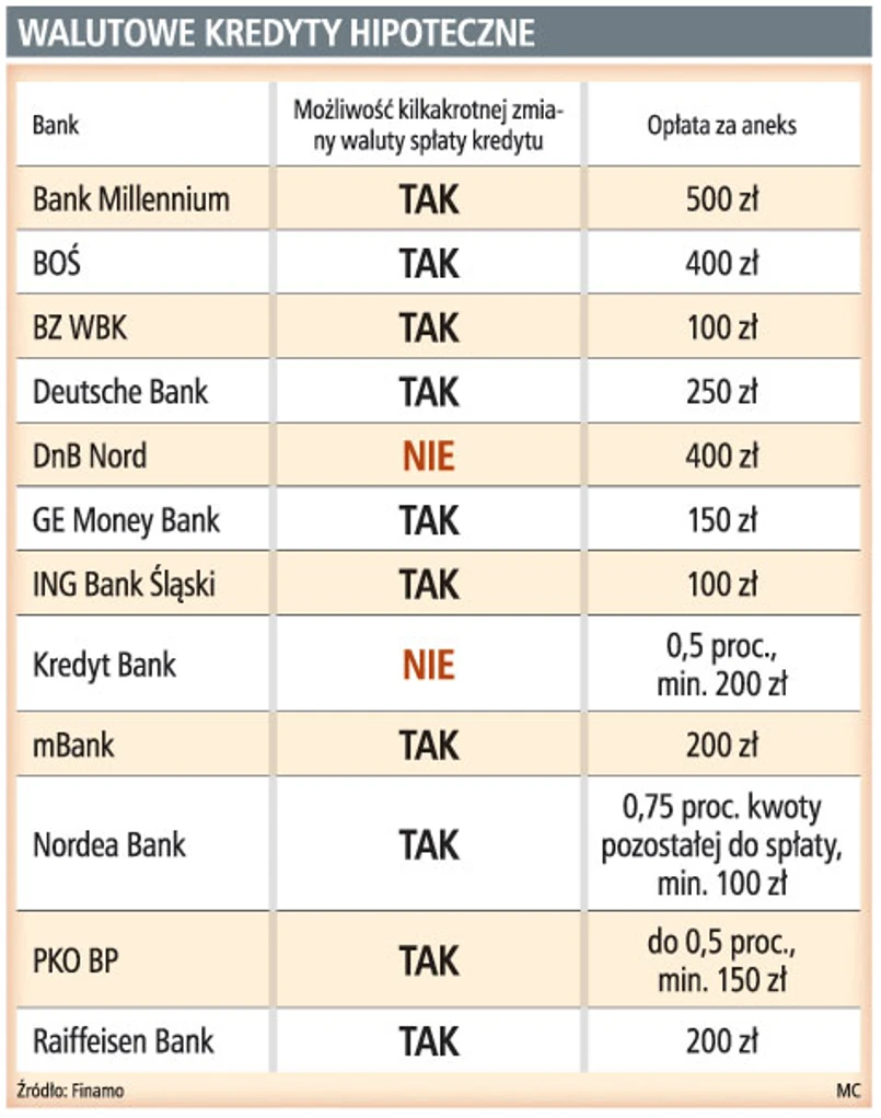 W niektórych bankach podwyżki za aneks do umowy wprowadzono w ostatnim czasie. – W PKO BP opłatę za aneks zmieniono ze 150 zł, na 0,5 proc. kwoty kredytu (minimum 150 zł) – mówi Paweł Majtkowski z Finamo. Zupełnie inna sytuacja jest w GE Money Bank. – Jeśli klient podpisze z nami aneks do umowy kredytowej, bo chciałby spłacać kredyt bezpośrednio w walucie, to potem, w zależności od swoich potrzeb, może spłacać ten kredyt w walucie lub złotówkach. Taki aneks kosztuje u nas 150 zł – mówi Katarzyna Ewert z GM Money Bank. Czyli po podpisaniu umowy jednego miesiąca można kredyt spłacać we frankach szwajcarski, a w kolejnym można ratę zapłacić w złotych. W innych bankach każdorazowa zmiana waluty, w jakiej spłacamy pożyczkę, wymaga podpisania aneksu do umowy kredytowej.