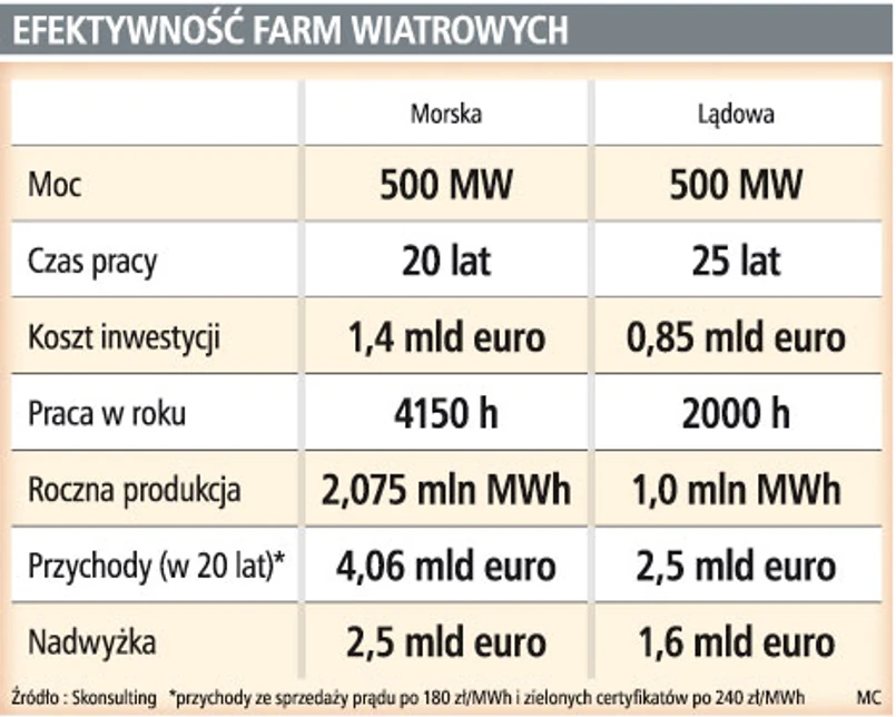 – Z góry zakładamy, że farmy powstaną poza obszarami chronionymi programem Natura 2000. Nie chcemy konfliktów ekologicznych ani skarg, że komuś przeszkadza widok wiatraków z brzegu – mówi Bogdan Gutkowski. Budową farm na morzu zainteresowana jest PGE. Chce wybudować farmy o mocy do 1000 MW, wstępnie wybrała trzy lokalizacje. Gdyby dzisiaj chciała zacząć badania dna morskiego pod farmę 500 MW, to za pozwolenie lokalizacyjne musiałaby zapłacić około 60 mln zł. SKonsulting złożył w sejmowej Komisji Przyjazne Państwo projekt zmiany przepisów. Chce, żeby za pozwolenie lokalizacyjne płacić najpierw 10 proc. jego wartości, kolejne 30 proc. po uzyskaniu pozwolenia na budowę, a resztę po uruchomieniu wiatraków. Pokonanie barier prawnych, przygotowanie projektów i same inwestycje, które trwają sześć, siedem lat pozwalają szacować, że pierwsze farmy na Bałtyku ruszą za około dziesięć lat.