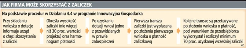 Droga przedsiębiorców po zaliczki może być jeszcze łatwiejsza. Ministerstwo Rozwoju Regionalnego pracuje nad zmianą przepisów, która umożliwi refundowanie kosztów zakupu zabezpieczeń stosowanych przy zaliczkach lub przy samych dotacjach (zabezpieczenie ma być gwarancją, że firma po otrzymaniu wszystkich pieniędzy z UE przez okres trzech lub pięciu lat nie zlikwiduje zrealizowanego projektu, np. nie sprzeda zakupionych maszyn). Jeśli zmiana prawa wejdzie w życie, to przedsiębiorca zabezpieczenie będzie mógł wrzucić w koszty inwestycji. Nowe przepisy mają obowiązywać tylko w programie Innowacyjna Gospodarka.