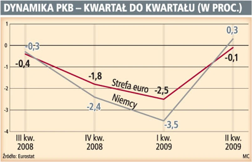 Dobre wieści z Niemiec i niezłe z Francji (kwartalny wzrost także o 0,3 proc.) wywołały falę pełnych nadziei komentarzy zachodnich ekspertów. – Główne gospodarki wychodzą z silnego osłabienia, ale ciągle jest pytanie o siłę i trwałość tej poprawy – uważa Lena Komileva, ekonomistka Tullett Prebon z Londynu, cytowana przez agencję Bloomberg. Wyniki gospodarek niemieckiej i francuskiej podbiły nieco dynamikę PKB całej strefy euro. W II kwartale PKB spadło tam o 0,1 proc. w ujęciu kwartalnym. Eksperci spodziewali się spadku o 0,5 proc.