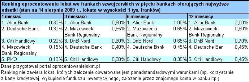 | Ranking oprocentowania lokat w złotych w dziesięciu bankach oferujących najwyższe odsetki (stan na 14 sierpnia 2009 r., lokata w wysokości 1 tys zł) | ||||||||||||