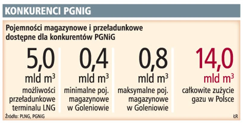 Pojawia się realna szansa na częściowe ograniczenie monopolu Polskiego Górnictwa Naftowego i Gazownictwa (PGNiG) i zwiększenie konkurencyjności na rynku gazu. Dotychczas głównymi barierami dla wchodzenia na nasz rynek nowych podmiotów były: obowiązek utrzymywania zapasów gazu oraz brak infrastruktury do importu surowca. W perspektywie najbliższych pięciu, sześciu lat część tych ograniczeń ma zostać zniesiona. Do importu będzie służył terminal LNG. Ma zostać uruchomiony w połowie 2014 roku i być dostępny dla wszystkich podmiotów, nie tylko PGNiG. Jednak importerzy zobowiązani są nadal do utrzymywania zapasów gazu. Ustawa o zapasach przewiduje zwolnienie z obowiązku utrzymywania zapasów tylko firmy działające w mikroskali. Nie muszą ich gromadzić ci, od których gaz odbiera nie więcej niż 100 tys. osób, a import surowca nie przekracza 50 mln m sześc. rocznie. Deficyt magazynów sprawia, że importerzy musieliby budować własne obiekty. W efekcie inwestycje gazowe w Polsce są dla nich nieopłacalne.