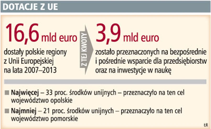 Dane ministerstwa pokazują, że wsparcie dla biznesu to najlepiej realizowany obszar regionalnych programów operacyjnych. Do tej pory podpisano umowy na przyznanie dotacji z ponad trzema tysiącami firm, do których trafi blisko 5 mld zł unijnych pieniędzy. – Regiony bardzo szybko dzielą fundusze unijne dla firm. W ten sposób najłatwiej jest im zrobić dobry wynik i pokazać, że województwo radzi sobie z wydatkowaniem środków unijnych. Biznes może wchłonąć prawie każdą ilość unijnych pieniędzy i szybko je wydać – uważa Marzena Chmielewska, dyrektor Departamentu Funduszy Strukturalnych w PKPP Lewiatan.