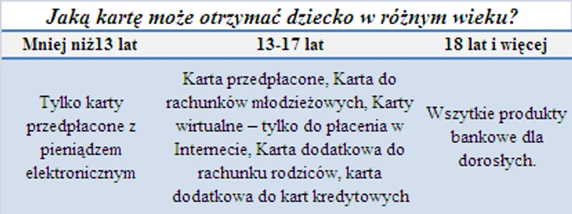 Z kart płatniczych mogą korzystać nie tylko dorośli, ale także dzieci. W większości przypadków wymagane jest jednak, aby ukończyły 13 lat. Funkcjonują jednak również karty, którymi mogą posługiwać się nawet młodsze dzieci – wynika z analizy firmy Expander Niezależny Doradca Finansowy. Chodzi tu o niektóre karty przedpłacone. Karty przedpłacone są rodzajem elektronicznej portmonetki, które dzielą się na dwa podstawowe rodzaje. Pierwsze są karty doładowywane środkami finansowymi podobnie jak telefon komórkowy. Drugi ich rodzaj posiada z góry określony limit po wykorzystaniu którego nie można z nich korzystać.