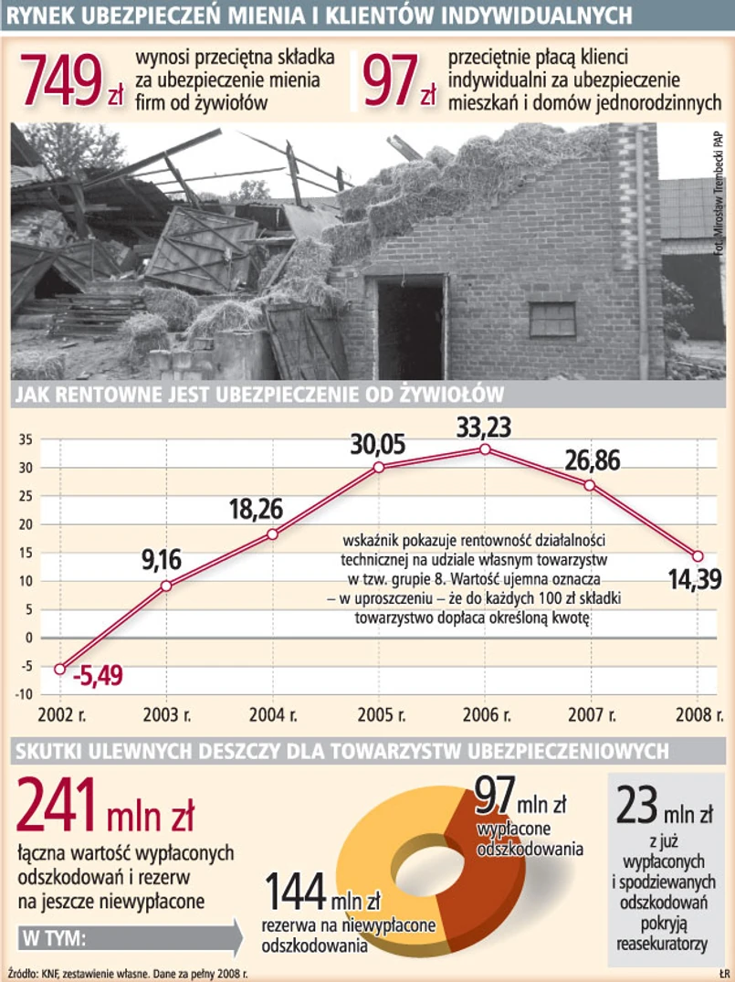 – Zakłady ubezpieczeń mogą obawiać się podniesienia stawek reasekuracyjnych z uwagi na czerwcowe i lipcowe podtopienia oraz powodzie w Polsce i w Czechach, czy takie zdarzenia jak pożar zakładów mięsnych JBB w Łysych – czytamy w raporcie KNF. Według ostatnich danych zebranych przez nadzór do tej pory już wypłacono niemal 100 mln zł odszkodowań za powodzie i podtopienia w Polsce, a na spodziewane kolejne 144 mln zł towarzystwa utworzyły rezerwy. – Szkoda w Łysych będzie kosztowała cały sektor ubezpieczeń około 100 mln zł – szacuje Andrzej Klesyk, prezes Grupy PZU, która była głównym ubezpieczycielem zakładu. Eksperci dodają, że nieco mniejszych, ale wciąż znaczących szkód było w tym roku kilka.