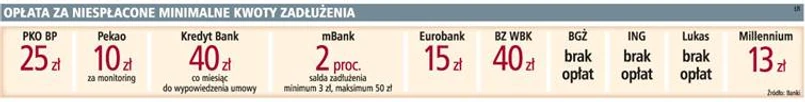 W Pekao nie ma opłat za niespłacenie minimalnej kwoty karty kredytowej, ale jest opłata za monitoring w wysokości 10 zł. Przy braku wpłaty klient będzie natychmiast monitorowany, więc poniesie koszty. W Kredyt Banku klient ponosi opłatę manipulacyjną za obsługę zadłużenia opóźnionego w wysokości 40 zł. – Opłata ta jest pobierana od klienta co miesiąc, aż do czasu spłaty długu lub wypowiedzenia umowy o kartę kredytową przez jedną ze stron – mówi Agnieszka Glińska-Pytlarz z Kredyt Banku. Dodatkowo klient zapłaci po 15 zł za dwa monity, który wysyła bank, jeśli karta nie zostanie spłacona w trzecim i czwartym okresie rozliczeniowym.