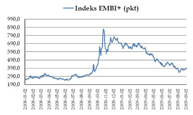 Zachowanie wskaźnika obrazującego premię za ryzyko na świecie trafnie podpowiadało przesilenie na rynkach akcji, ale jednocześnie potwierdza też, że nie doszło wciąż jeszcze do ostatecznych rozstrzygnięć. Obraz wynikający z zachowania indeksu EMBI+, cen walut na rynkach wschodzących i akcji na świecie jest dość spójny. Na wszystkich tych rynkach znaleźliśmy się na poziomach, których przekroczenie będzie potwierdzeniem nasilenia się negatywnych zjawisk. Dla EMBI+ wypada przy 400 pkt, dla CHF/PLN przy 2,755 zł, a dla WIG przy 35,8 tys. pkt.