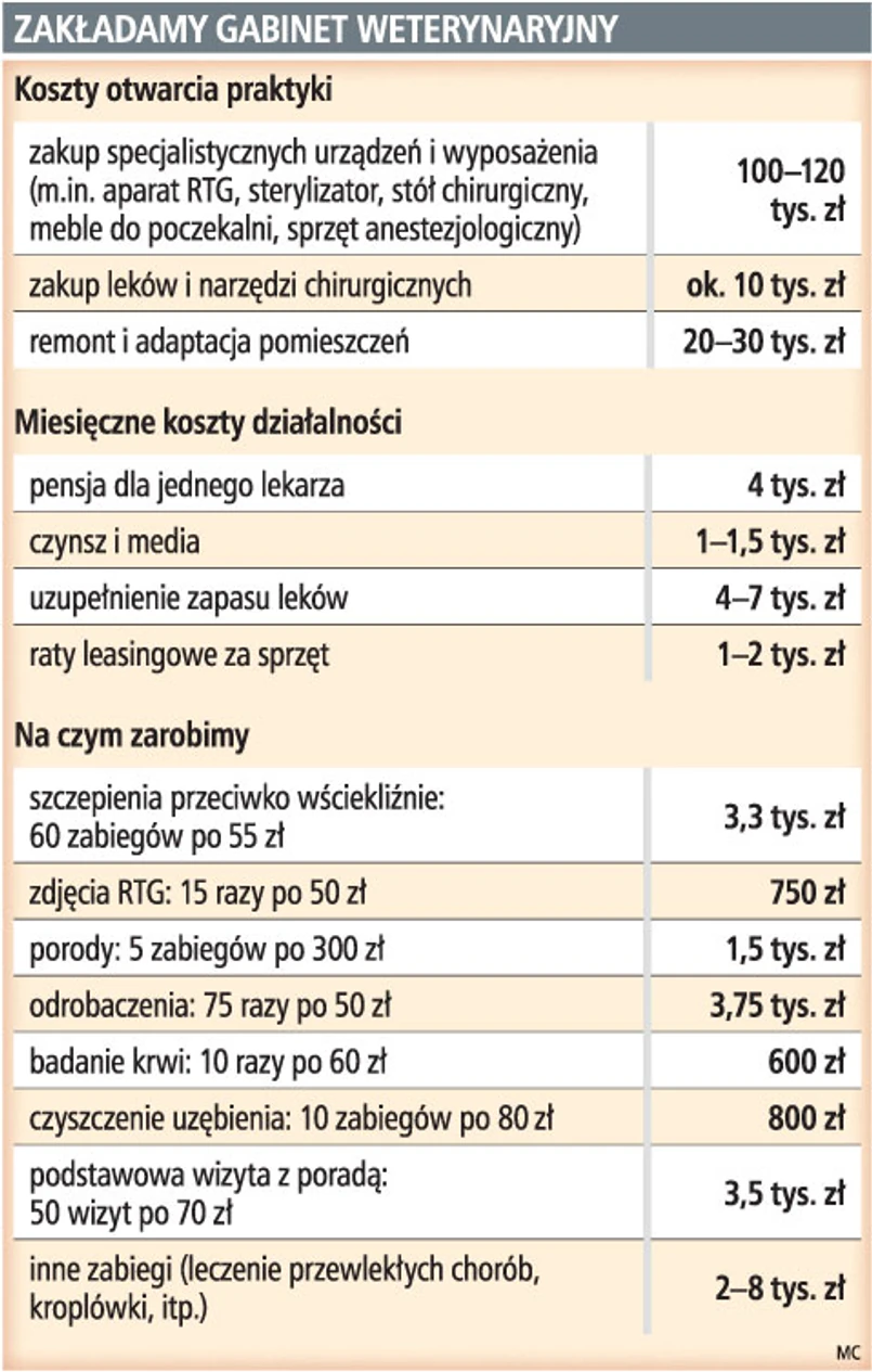 GP policzyła, że otwarcie gabinetu kosztuje od 130 do 160 tys. zł. Najwięcej pochłoną zakupy specjalistycznego sprzętu i wyposażenia. Na obowiązkowej liście niezbędnych urządzeń znajdują się m.in. aparat RTG, sterylizator, stół chirurgiczny, sprzęt anestezjologiczny, stetoskop, termometry, meble do poczekalni. Początkowe koszty otwarcia gabinetu można obniżyć, starając się o leasing najdroższego sprzętu. Należy jednak pamiętać, że taka operacja będzie oznaczała znaczną podwyżkę miesięcznych kosztów funkcjonowania firmy, które w przypadku placówek leczących zwierzęta nie należą do najniższych.