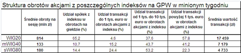 Jednocześnie miniony tydzień oznaczał spadek udziału obrotów walorami z WIG w łącznych obrotach do 65,2%, najniższego poziomu od miesięcy. To oznacza z jednej strony, że najwięksi gracze (w dużej części zapewne zagraniczni) przyjęli wyczekującą postawę, a z drugiej, że inwestorzy coraz bardziej skupiają się na najbardziej ryzykownych spółkach, czyli małych i średnich.
