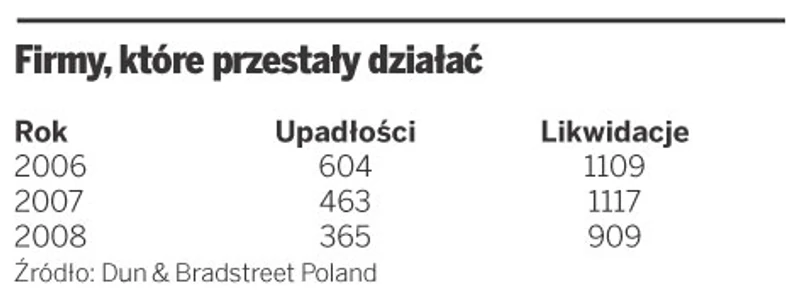 – Na koniec roku spodziewamy się 1,7–1,85 tys. upadłości i likwidacji firm – mówi Tomasz Starzyk z Dun & Bradstreet. Firma policzyła, że od początku roku z rynku zniknęło aż 1236 przedsiębiorstw. W całym roku osiągniemy poziom zbliżony do tego z 2006 roku kiedy przestało działać 1713 firm. W bardzo słabych latach 2003–2004 notowano po ponad 2,2 tys. takich zdarzeń.