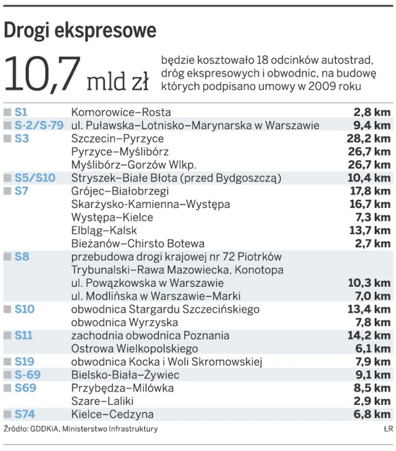 Rządowy program budowy dróg i autostrad, przyjęty jeszcze przez poprzedni rząd, zakłada wybudowanie ok. 2 tys. km dróg ekspresowych. W lutym 2008 r. Cezary Grabarczyk, minister infrastruktury, obiecywał, że do Euro 2012 gotowe będą m.in. droga S5 z Wrocławia do Grudziądza, S7 z Gdańska przez Warszawę aż za Kraków, S8 z Wrocławia do Białegostoku czy prawie cała droga S3 ze Szczecina do czeskiej granicy. Już wiadomo, że planu nie uda się zrealizować.