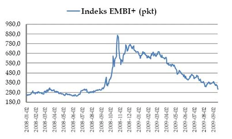 Przez dłuższy czas indeks cen akcji z rynków wschodzących piął się w górę, a premia za ryzyko inwestycji w tej grupie krajów nie była w stanie spaść poniżej dołka z wakacji. W ostatnich dniach jednak ostatecznie do tego doszło. Indeks EMBI+ zszedł do 312 pkt, czyli poziomu ostatni raz widzianego w początkach września 2008 r. O ile spadkowa tendencja na krótką metę jest korzystna z punktu widzenia postrzegania wschodzących rynków akcji, to na dłuższą metę osiągnięcie takiego poziomu, jak obecny, obrazuje przekonanie inwestorów, że sytuacja gospodarcza oraz na rynkach praktycznie wróciła do normy. Jesteśmy już poniżej średniej z okresu od początku 2008 r.