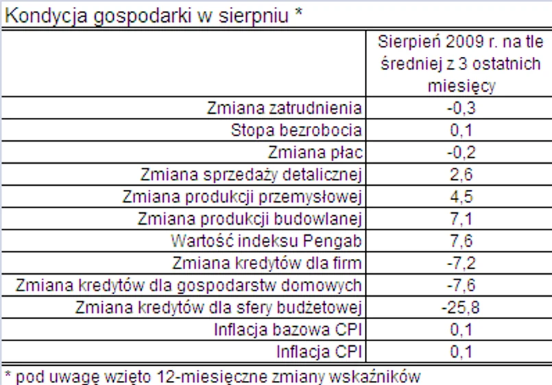 Sierpniowa produkcja przemysłowa spadła o 0,2% r/r wobec 4,7-proc. średniej zniżki w 3 wcześniejszych miesiącach. Sprzedaż detaliczna podniosła się o 5,2% w ubiegłym miesiącu wobec 2,6% przeciętnego wzrostu w okresie maj-lipiec. Wyraźny progres następował w zakresie produkcji budowlano montażowej, choć jest on efektem jedynie przyspieszenia w realizacji projektów infrastrukturalnych. Poprawiały się nastroje w branży finansowej, czego efektem był skokowy wzrost indeksu Pengab.