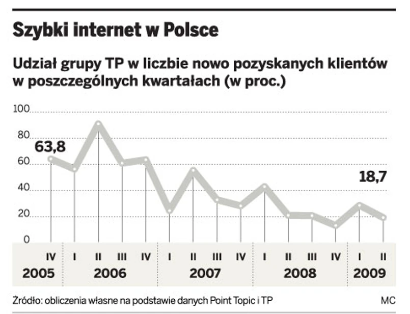 Grupa TP w II kwartale zdobyła jedynie 25 tys. nowych klientów. Jej udział w rynku szerokopasmowego internetu po raz pierwszy spadł poniżej 50 proc., do 49,6 proc. Rok wcześniej wynosił 56,7 proc. Udział TP w rynku szerokopasmowego internetu dostarczanego za pomocą łączy telefonicznych zmniejszył się do 75,7 proc. z 83,8 proc. rok temu.