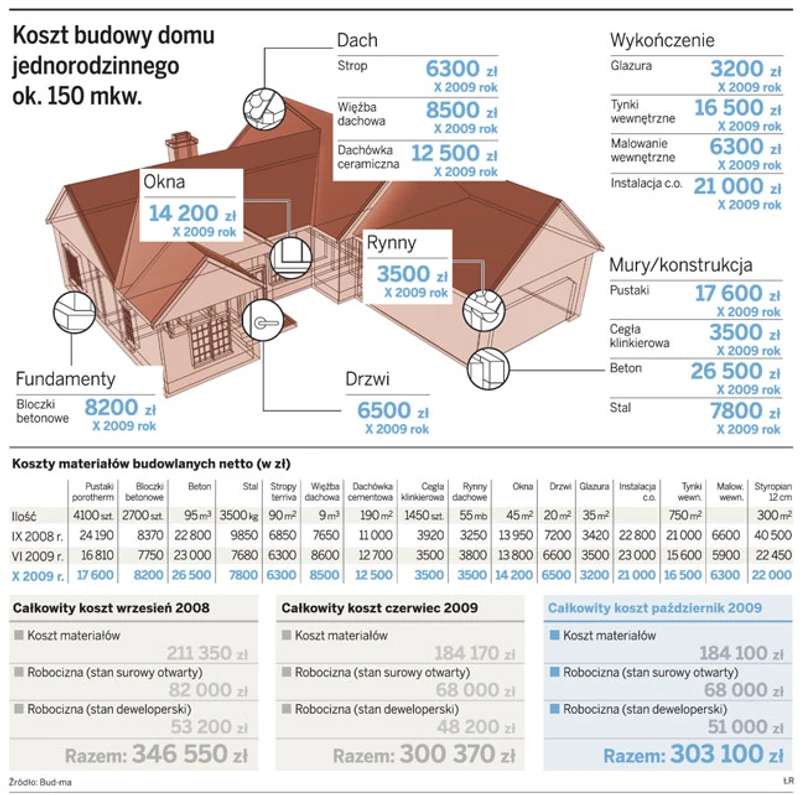 Od czerwca, kiedy ostatnio obliczaliśmy koszt budowy naszego hipotetycznego domu wielkości 150 metrów kwadratowych, kwota, jaką musimy wydać na doprowadzenie do tzw. stanu deweloperskiego, zwiększyła się nieznacznie, bo o ok. 3 tys. zł, do 303 tys. zł. Nadal jednak koszt budowy jest o ok. 15 proc. niższy niż przed rokiem.