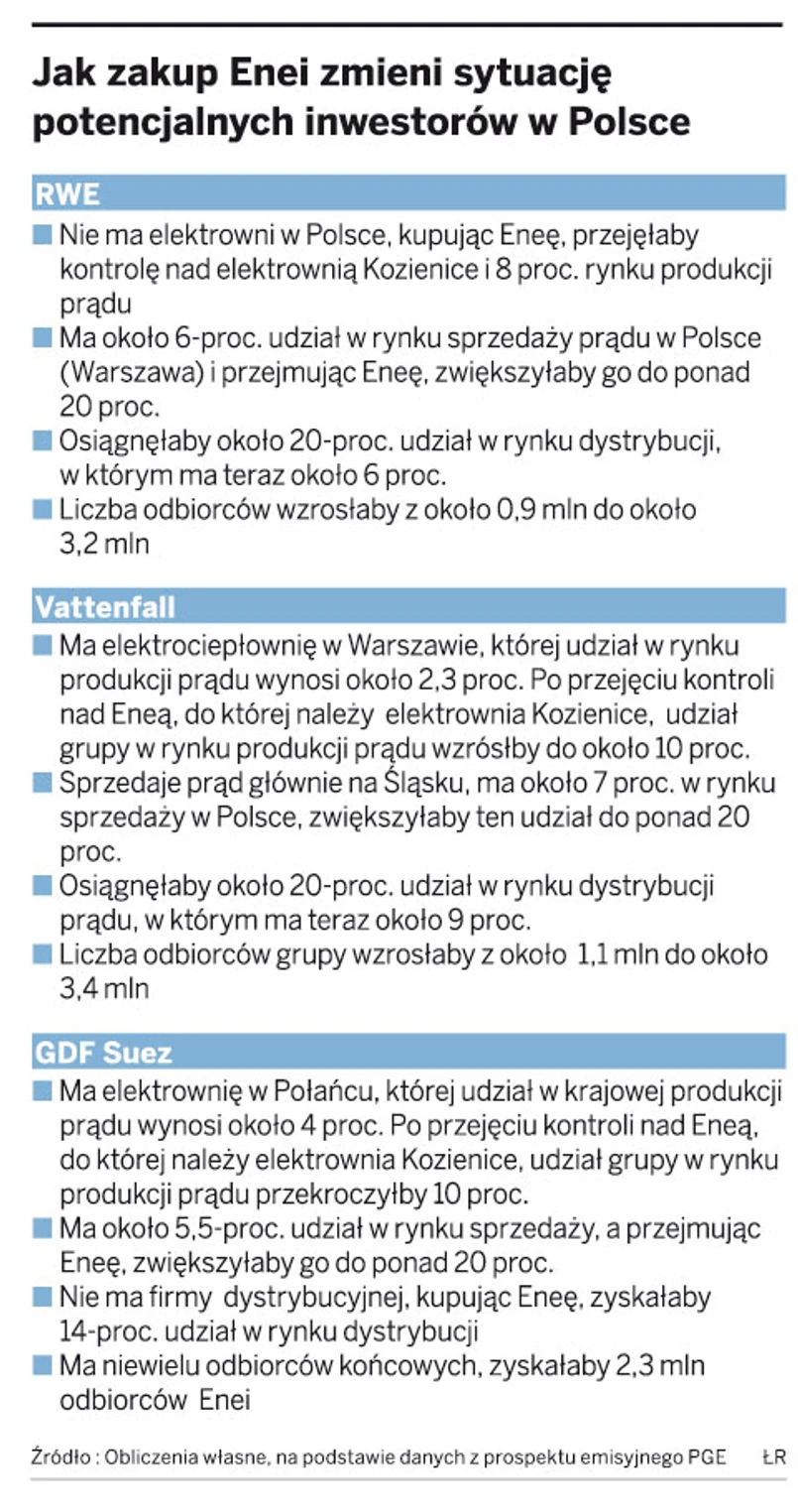 Gdyby Eneę przejął RWE, Vattenfall czy GDF Suez, to po transakcji każda z grup stałaby się trzecim graczem na większości segmentów rynku energii w Polsce. – W każdym przypadku prywatyzacja Enei oznaczałaby wzrost konkurencji na rynku, bo zmieni strukturę właścicielską – ocenia Grzegorz Onichimowski, prezes Towarowej Giełdy Energii.
