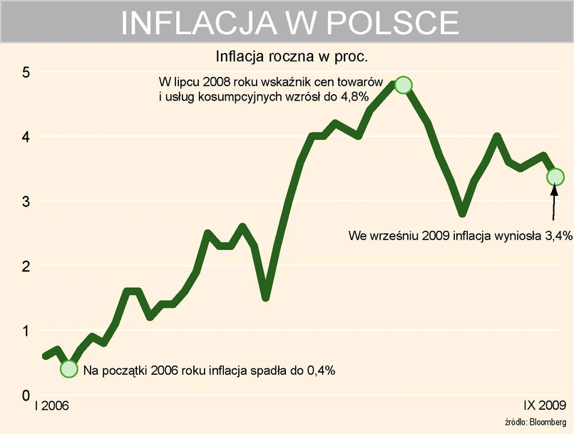 Główna ekonomistka Banku BPH Maja Goettig - Spadek inflacji we wrześniu w porównaniu do sierpnia wynikał m. in. z wyhamowania rocznej dynamiki cen żywności oraz cen użytkowania mieszkania i nośników energii. Skala wyhamowania cen w tych dwóch kategoriach okazała się większa niż zakładaliśmy. Dodatkowym czynnikiem obniżającym roczny wskaźnik inflacji we wrześniu był niższy niż przed rokiem miesięczny wzrost cen alkoholu i tytoniu. W kolejnych miesiącach do końca roku spodziewamy się stabilizacji inflacji w przedziale 3,3-3,4% rok do roku, a w grudniu wzrostu wskaźnika CPI do ok. 3,7% r/r, za sprawą niskiej bazy w cenach paliw z grudnia ubiegłego roku. Dopiero początek 2010 r. przyniesie zdecydowany spadek inflacji. Wrześniowe dane dotyczące inflacji nie zmieniają perspektyw dla RPP. Spodziewamy się, że stopy procentowe pozostaną na obecnym poziomie do końca 2009 roku.