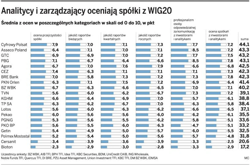 Słabo wypadły firmy z największym udziałem w indeksie. PKN Orlen jako jedyny zajął miejsce w pierwszej dziesiątce. Nie udało się to KGHM, Telekomunikacji Polskiej oraz bankom Pekao i PKO BP. Najgorzej ocenione zostały kontrolowany przez Michała Sołowowa Cersanit oraz Bioton. Firmy zdobyły odpowiednio zaledwie 20,6 i 17,2 pkt na 60 możliwych. Choć wszyscy uczestnicy ankiety zastrzegli sobie zachowanie anonimowości przy publikacji komentarzy do oceny spółek, w przypadku tych firm brzmią one bardzo podobnie.