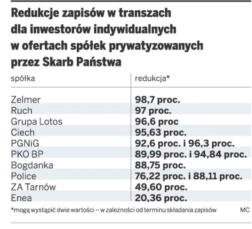 Według wyliczeń DGP, jeśli zgodnie z planem trafi do nich zaledwie 10 proc. sprzedawanych akcji PGE (o wartości 600 mln zł), redukcje zapisów przekroczą 96 proc. Nawet jeśli zarząd spółki podwoi transze dla osób fizycznych, redukcja będzie ogromna i wyniesie niemal 93 proc.