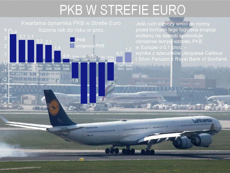 Jeśli ruch lotniczy wróci do normy przed końcem tego tygodnia erupcja wulkanu na Islandii spowoduje obniżenie tempa wzrostu PKB w Europie o 0,1 proc. – wynika z szacunków Jacquesa Cailloux i Silvio Peruzzo z Royal Bank of Scotland.