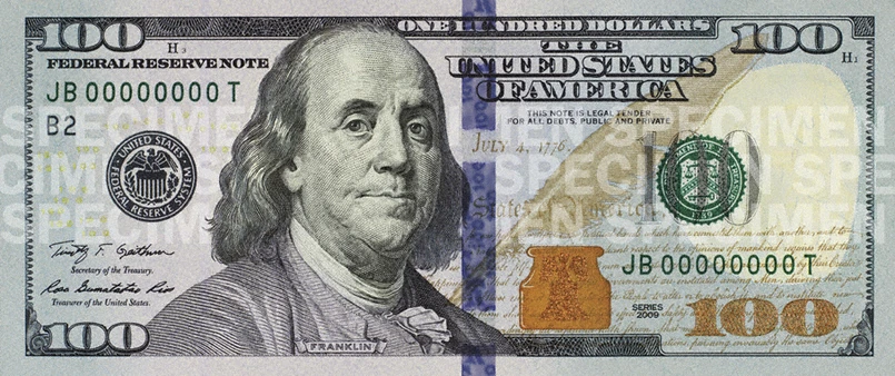 Na nowej studolarówce, podobnie jak na starej, wciąż widnieje portret jednego z ojców-założycieli Stanów Zjednoczonych Benjamina Franklina. Wśród nowych środków mających zapobiec fałszerstwom na uwagę zasługują przede wszystkim: trójwymiarowy jasnoniebieski pasek zabezpieczający biegnący przez środek banknotu oraz ukryty obraz Dzwonu Wolności, który można dostrzec po spojrzeniu na banknot pod odpowiednim kątem.