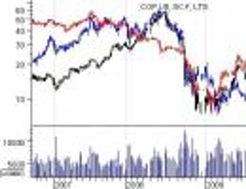 W ostatnich kilkunastu miesiącach notowania ropy i dwóch pozostałych spółek podążają w podobnym kierunku, ale jest to bardziej związane z ogólnym odbiciem na rynkach niż faktem, że obydwie firmy działają w branży petrochemicznej. Obok wykres obrazujący zachowanie Lotosu (czerwone świece), Conoco (niebieskie) i ropy Brent (czarne) w ujęciu tygodniowym od połowy 2006 roku do dzisiaj.