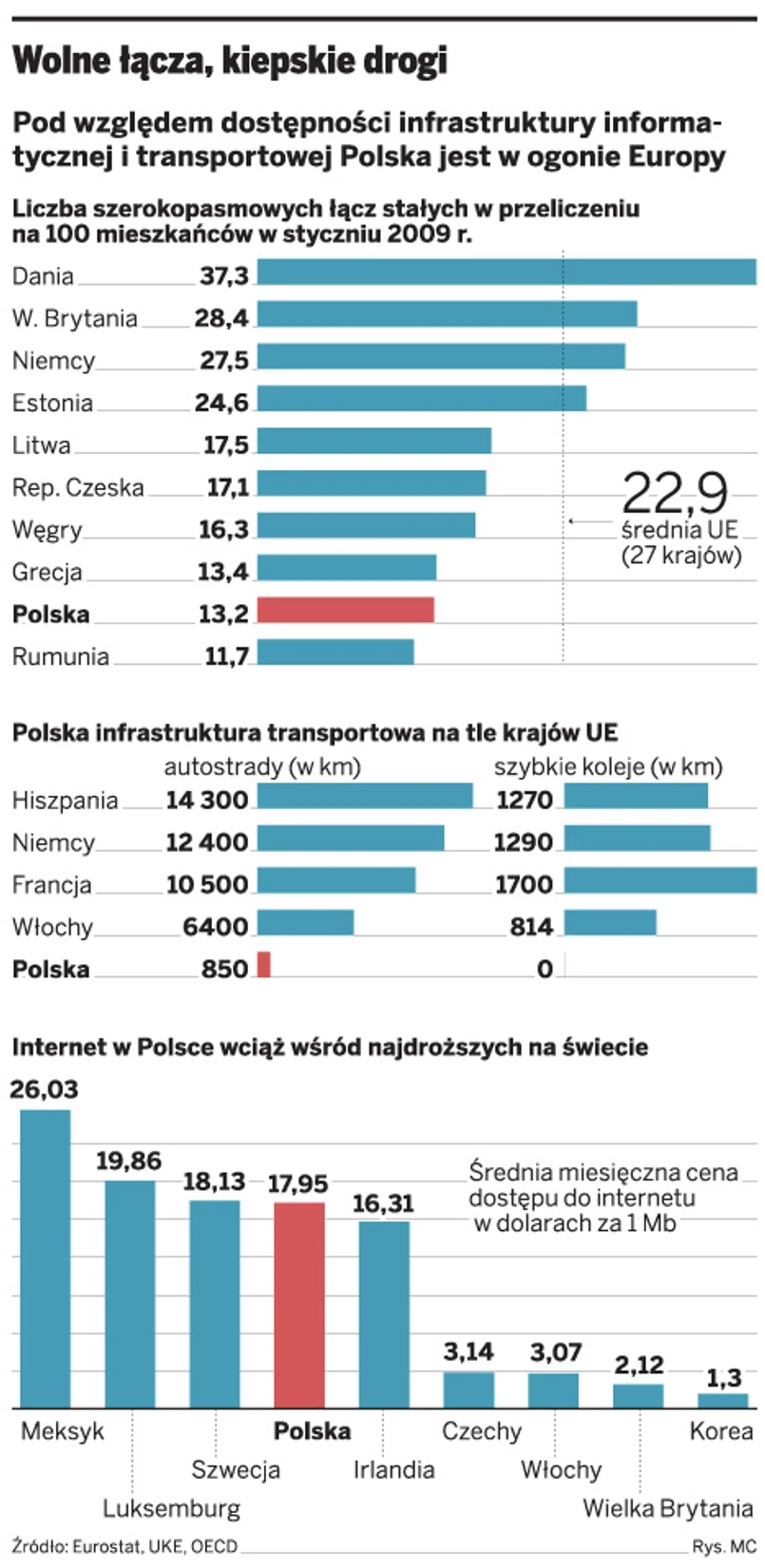 Na koniec 2009 roku 51 proc. gospodarstw domowych w Polsce miało dostęp do szerokopasmowego internetu. Wprawdzie sytuacja poprawia się całkiem szybko (wzrost o 30 proc. w dwa lata), ale jednak ten wynik na tle innych państw Europy jest słaby. Wyprzedzają nas choćby kraje regionu, jak Czechy, Węgry czy Estonia. Co gorsza, w sporej części domostw w Polsce internet, ze względu na niewielkie przepustowości, szerokopasmowy jest tylko z nazwy. Wciąż dostępu do niego nie ma prawie połowa Polaków.