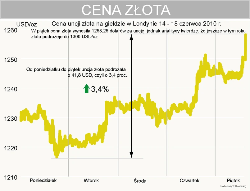 Podczas piątkowych notowań na giełdzie w Londynie, cena złota skoczyła po południu do 1258,25 dolarów za uncję pobijając tym samym rekord z 8 czerwca jakim był poziom 1252,11 dolarów. Dolar osłabił się wówczas z powodu obaw inwestorów o spowolnienie ożywiania gospodarczego USA i dręczący państwa UE kryzys zadłużenia. W ciągu ostatniego tygodnia, złoto podrożało już o 41,8 dolarów, czyli o 3,4 proc.