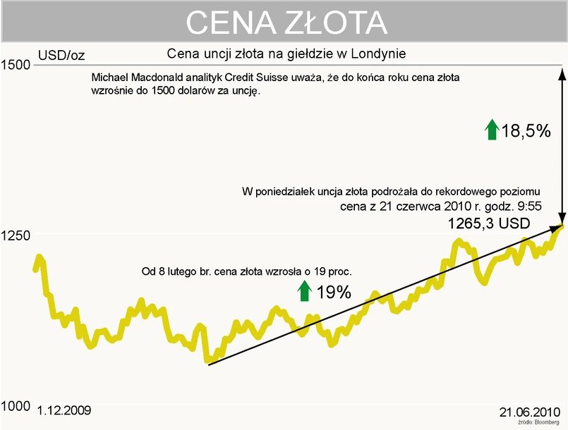 "Ceny złota mogą osiągnąć poziom 1500 dolarów za uncję - o 19 proc. więcej niż rekord wszech czasów, który został ustanowiony 10 czerwca na poziomie 1262,50 dolarów" - powiedział Michael Macdonald, analityk techniczny z Credit Suisse.
