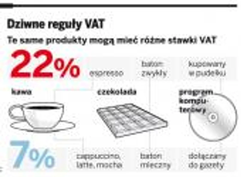 Tu espresso opodatkowane jest stawką 22-proc., ale latte – tylko 7-proc. Wszystko dlatego, że w drugim przypadku do kawy trafia sporo mleka, na które obowiązuje stawka 7-proc. Reguła jest zaś taka, że ten produkt którego jest więcej lub który ma zasadnicze znaczenie w składzie danego towaru, ustawia stawkę VAT na całość.